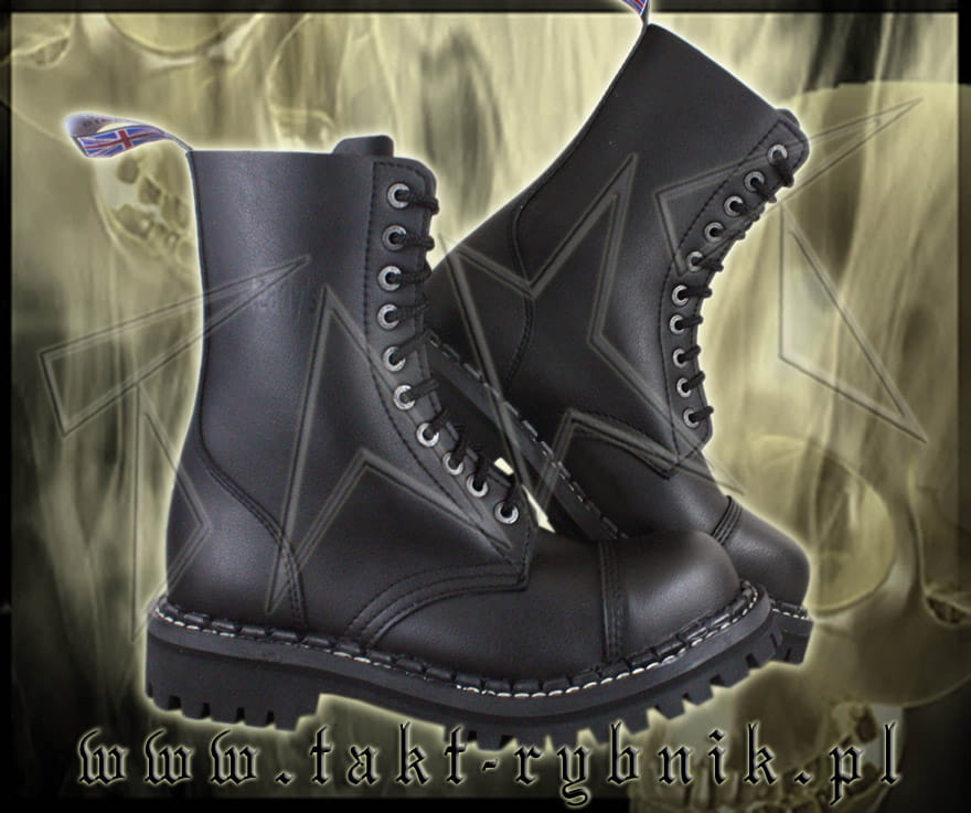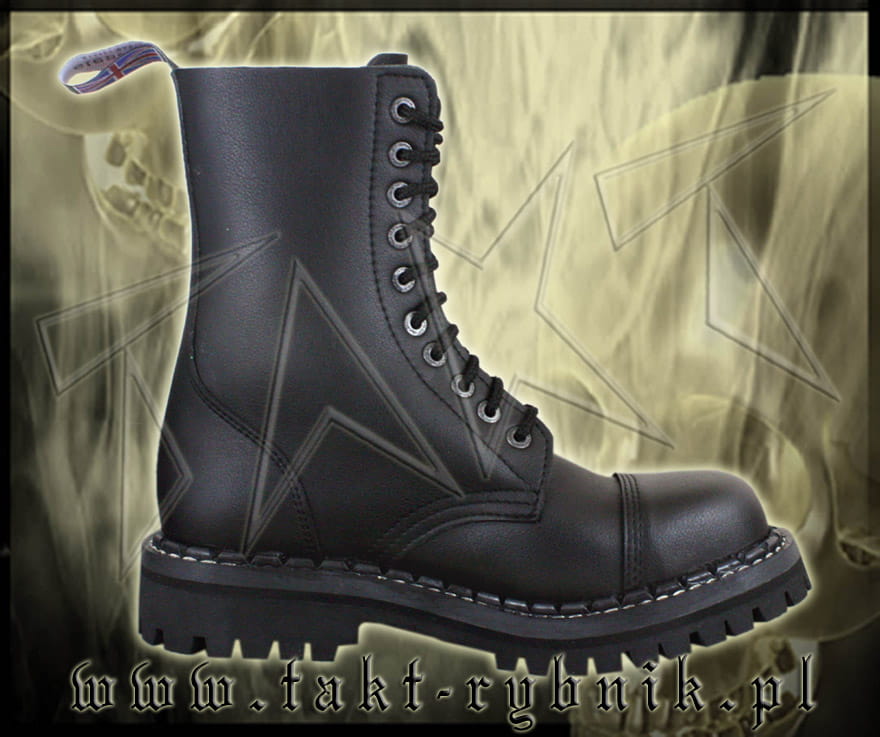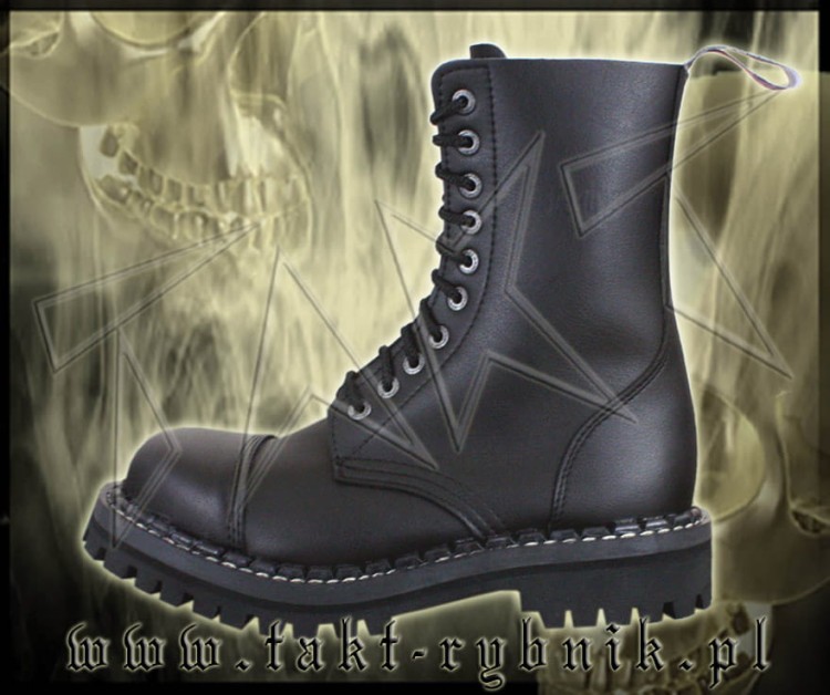 Glany 10-dziurowe firmy STEADY'S w wersji VEGAN - wykonane ze skóry ekologicznej. Kolor czarny. Nosek wzmocniony blachą z przeszyciem. Podeszwa klejona z wkrętami metalowymi. Wysokość podeszwy ok. 2,2 cm , obcas ok. 3,7 cm. Glany solidne i NIEZWYKLE EFEKTOWNE!!!