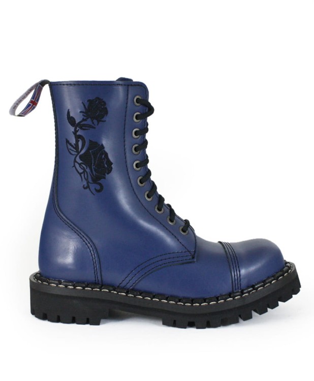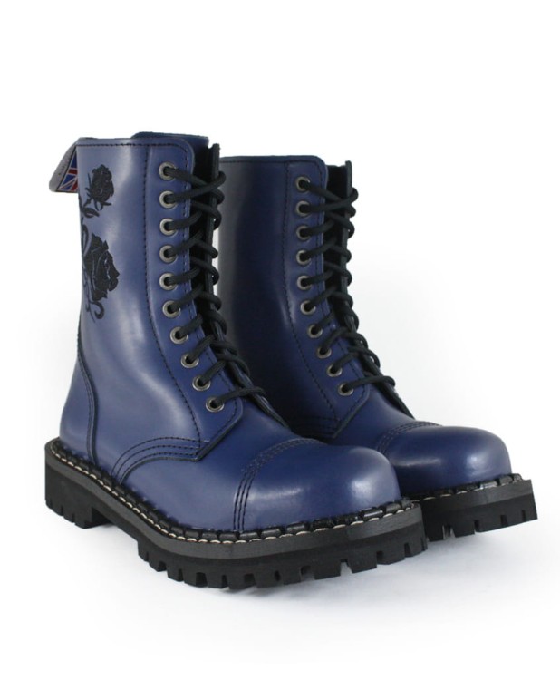 Glany skórzane, 10-dziurowe firmy STEADY'S. Kolor niebieski. Glany zdobione rewelacyjnym haftem po zewnętrznej stronie buta. Nosek wzmocniony blachą z przeszyciem. Podeszwa klejona z wkrętami metalowymi. Glany solidne i NIEZWYKLE EFEKTOWNE!!!