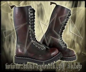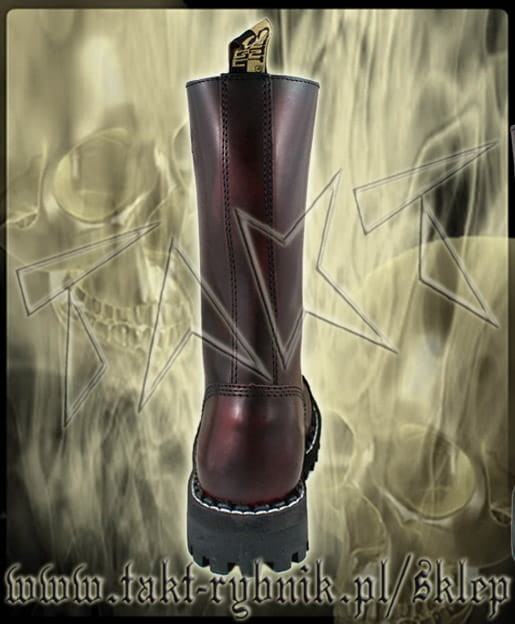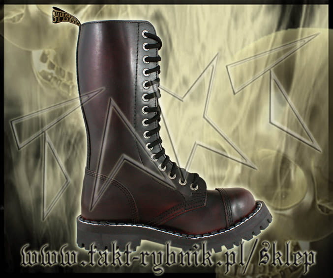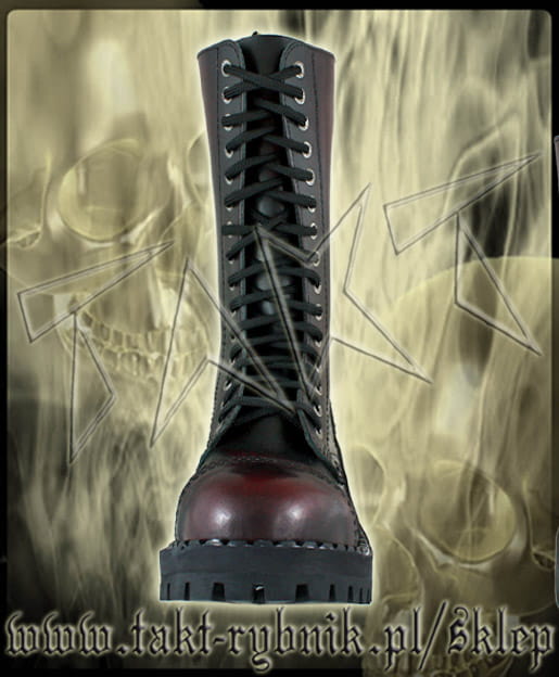Glany skórzane, 15-dziurowe firmy STEEL. Kolor czarny przecierany czerwonym. Nosek wzmocniony blachą z przeszyciem. Podeszwa klasyczna, klejona z wkrętami metalowymi. Wysokość podeszwy ok. 2,2 cm. Rozmiary od 36 do 47.
