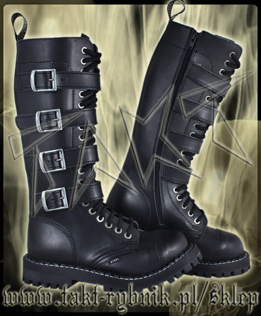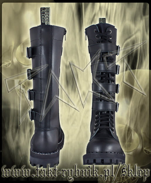 Glany 20-dziurowe firmy STEEL wykonane z czarnej skóry, nosek wzmocniony blachą z przeszyciem. Podeszwa klasyczna, szyto-klejona z wkrętami metalowymi. Wysokość podeszwy ok. 2,2 cm. Dla super efektu wizualnego glany posiadają dodatkowo cztery klamry. Po wewnętrznej stronie na całej wysokości wszyty został zamek w celu łatwego (szybkiego) wkładania i zdejmowania buta.