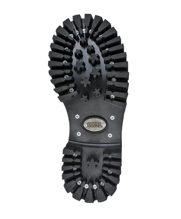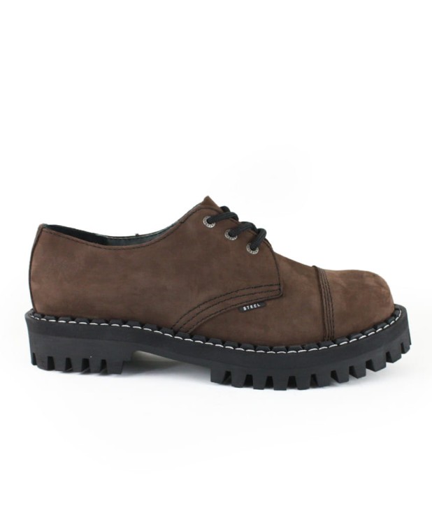 Glany skórzane, 3-dziurowe firmy STEEL. Materiał : nubuk. Kolor: brązowy. Nosek wzmocniony blachą z przeszyciem. Podeszwa klejona z wkrętami metalowymi. Model podeszwy : MONSTER - grubsza od podeszwy klasycznej - wysokość ok. 3 cm, obcas ok. 4,2 cm.