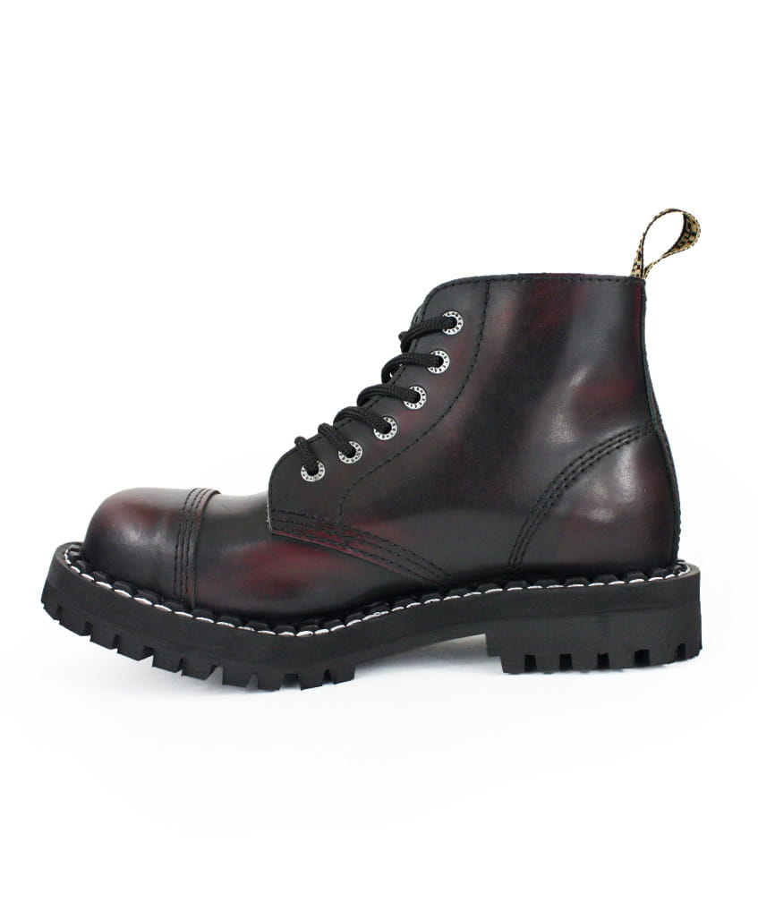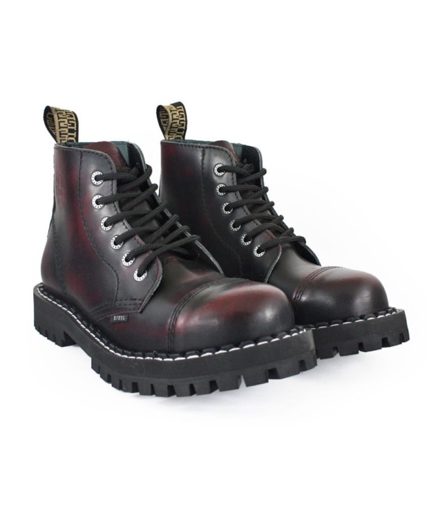 Glany 6 STEEL. Glany skórzane w kolorze bordowym przecierane czarnym. Nosek wzmocniony blachą z przeszyciem. Podeszwa klasyczna, szyto-klejona z wkrętami metalowymi. Wysokość podeszwy ok. 2,2 cm.