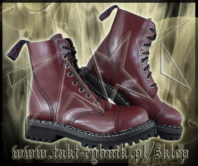 Glany skórzane, 8-dziurowe firmy STEADY'S. Kolor bordowy. Nosek wzmocniony blachą z przeszyciem. Podeszwa klejona z ozdobnym szyciem i wkrętami metalowymi. Glany solidne i NIEZWYKLE EFEKTOWNE!!!