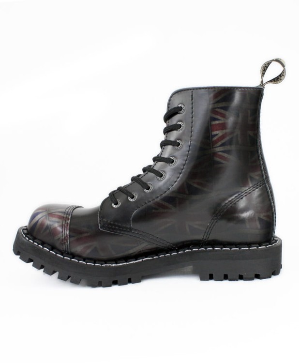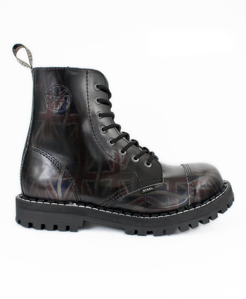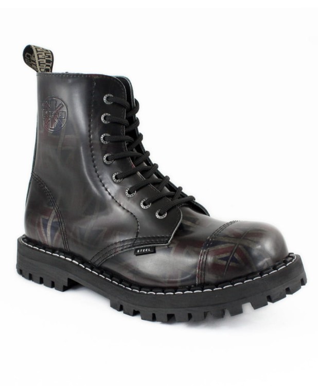 Glany skórzane, 8-dziurowe firmy STEEL. Kolor : UK black. Nosek wzmocniony blachą z przeszyciem. Podeszwa klasyczna, szyto-klejona z wkrętami metalowymi. Wysokość podeszwy ok. 2,2 cm.