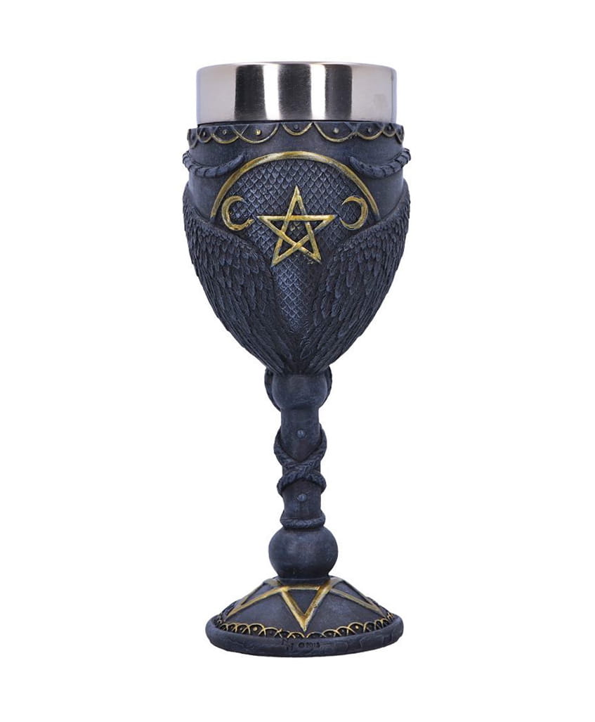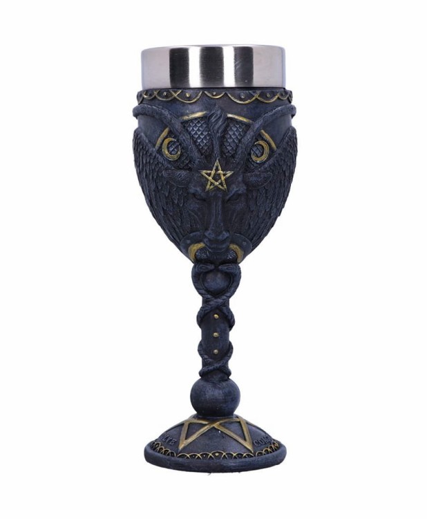 Niezwykle starannie wykonany z dużą ilością zdobień - m.in. z głową kozła i skrzydłami. Wnętrze kielicha wykonane ze stali nierdzewnej - wyjmowane. Zdobienia wykonane z żywicy organicznej. Ręcznie malowany.