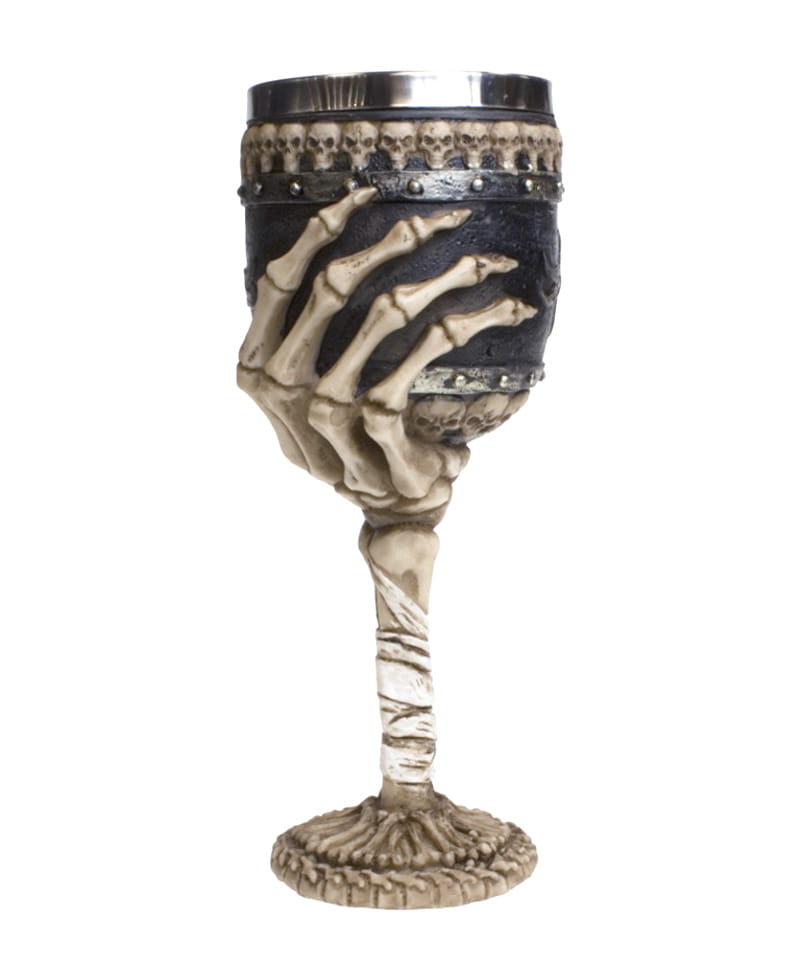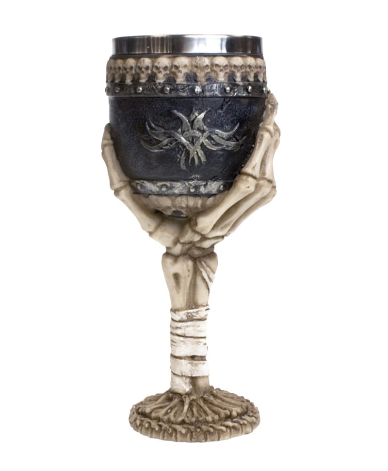 Niezwykle starannie wykonany z dużą ilością zdobień. Podstawa kielicha imituje rękę kościotrupa. Wnętrze kielicha wykonane ze stali nierdzewnej - wyjmowane. Zdobienia wykonane z żywicy organicznej. Pojemność ok. 180 ml. Produkt rekomendowany jako ozdoba.