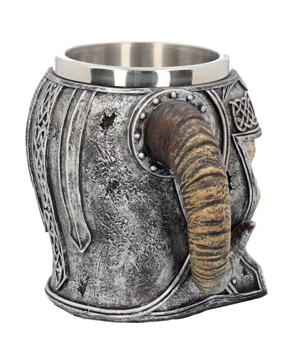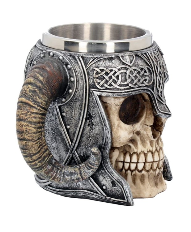 Kufel w kształcie czaszki wikinga ubranej w hełm z baranimi rogami, zdobiony wzorami celtyckimi. Niezwykle starannie wykonany z dużą ilością zdobień. Wewnętrzną część kufla wykonaną ze stali nierdzewnej można wyciągnąć. Zdobienia wykonane z żywicy organicznej.