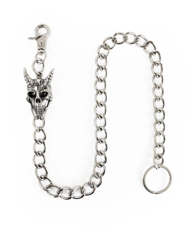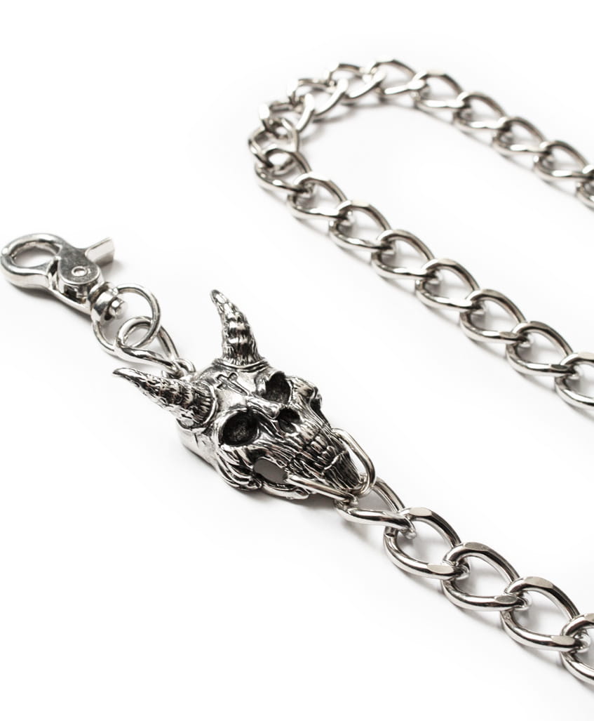 Łańcuch metalowy zdobiony dużym odlewem w kształcie czachy z rogami. Zamykany na karabinek. Łańcuch w kolorze srebrnym.