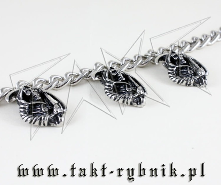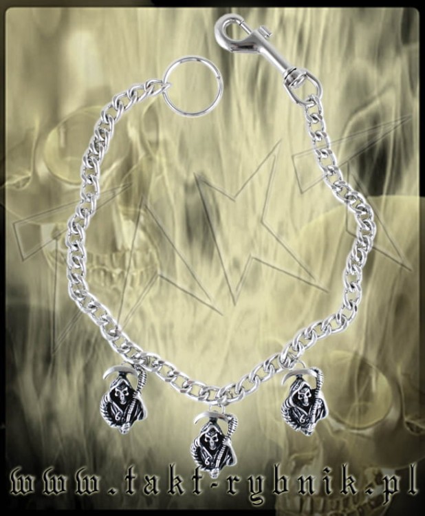Bardzo efektowny łańcuch z trzema zawieszkami w kształcie kostuchy. Zakończony witką i karabinkiem. Genialnie prezentuje się zwisając przyczepiony do szlufki spodni.