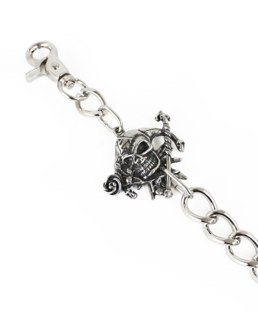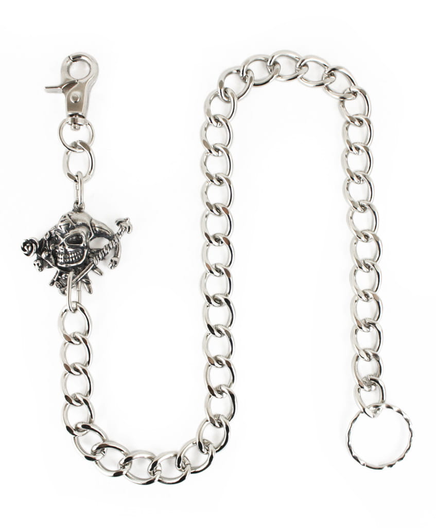 Łańcuch metalowy zdobiony odlewem w kształcie Jokera. Zamykany na karabinek. Łańcuch w kolorze srebrnym.