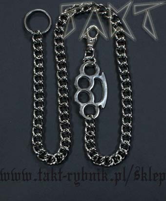 Łańcuch o długości ok. 62 cm. Zdobiony kastetem metalowym o wymiarach ok. 6 x 3,5 cm.