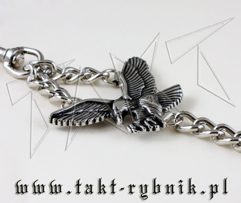 Łańcuch metalowy zdobiony dużym odlewem w kształcie orła. Zamykany na karabinek. Łańcuch w srebrnym.