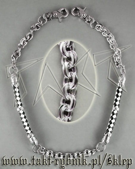Bardzo efektowny łańcuch metalowy. Złożony z pięciu części : trzy to łańcuch ze zdobionymi ogniwami, dwie części to plecionka ze skóry ekologicznej w kolorze biało-czarnym. Zakończony karabinkami.