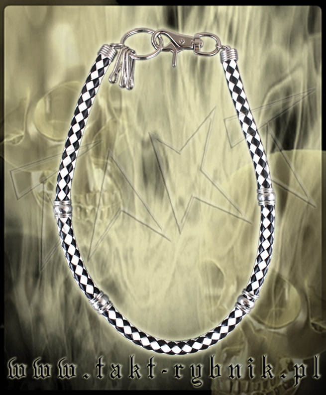 Bardzo efektowny łańcuch wykonany z plecionki ze skóry ekologicznej w kolorze biało-czarnym. Zdobiony metalowymi elementami w kolorze srebrnym. Zakończony karabinkiem oraz witką z dodatkowymi uchwytami.
