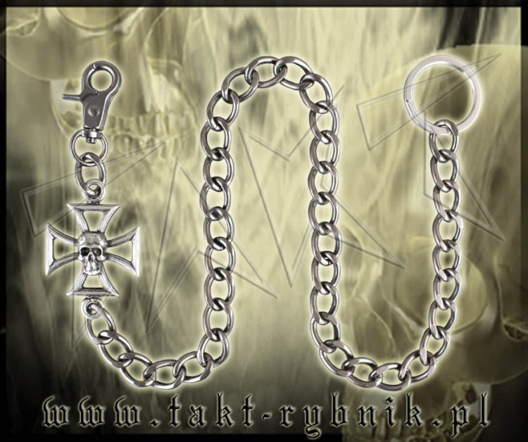 Efektowny gruby łańcuch metalowy kolor CZARNY o długości ok. 64 cm zakończony karabinkiem. Ogniwa wielkości ok. 1,3 x 1,8 cm. Łańcuch zdobiony metalowym odlewem w kształcie krzyża z czachą o wymiarach ok. 4 x 4 cm.