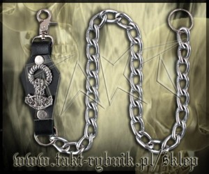 Bardzo efektowny, gruby łańcuch. Niklowany. Zakończony witką i karabinkiem. Ozdobny element skórzany w kształcie trumny a na nim zamocowany metalowy odlew w kształcie młotu Thora. Genialnie prezentuje się zwisając przyczepiony do szlufki spodni.