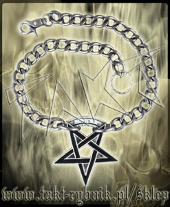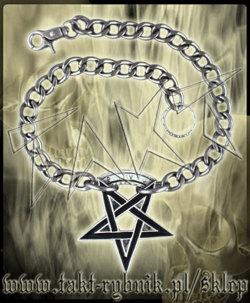 Łańcuch metalowy zdobiony dużym odlewem w kształcie pentagramu. Zamykany na karabinek. Łańcuch w kolorze czarnym. Pentagram srebrny, lakierowany.