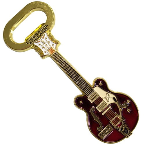Efektowny duży magnes w formie otwieracza w kształcie gitary z insygniami słynnej ulicy w Liverpool Mathew Street