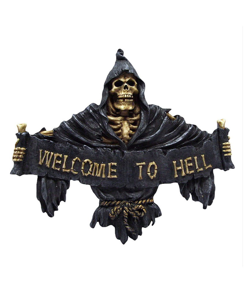 Ozdoba na ścianę wykonana z żywicy organicznej. Odlew w kształcie kościotrupa trzymającego transparent z napisem WELCOME TO HELL. Z tyłu znajduje się metalowy haczyk do zawieszenia dekoracji na ścianie.