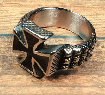 Ten imponujący pierścień ze stali nierdzewnej z uderzającym motywem Żelaznego Krzyża to prawdziwa gratka dla miłośników wyjątkowej biżuterii. Żelazny Krzyż, symbol siły i odwagi, nadaje pierścieniowi potężną aurę. Szczególnie uderzające są małe ząbki wbudowane w boki oprawy, nadające pierścieniowi wyjątkowy, dynamiczny wygląd. Pierścień wykonany jest z wysokiej jakości stali nierdzewnej 304, dzięki czemu jest wyjątkowo wytrzymały i trwały.