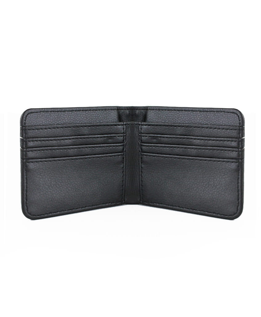 Portfel wykonany ze skóry ekologicznej, obszyty czarnymi nićmi. Wersja premium - materiał imitujący w wyglądzie skórę naturalną. Zdobiony nadrukiem z przodu oraz z tyłu portfela. W środku posiada przegródki na dokumenty oraz karty płatnicze.