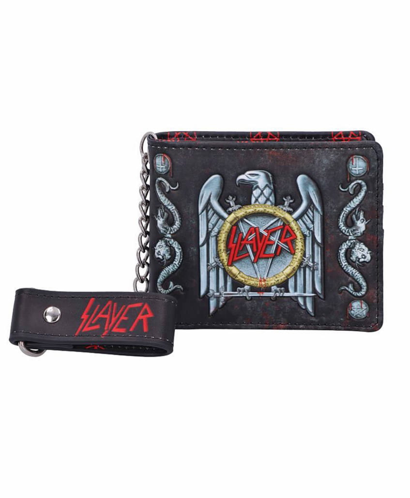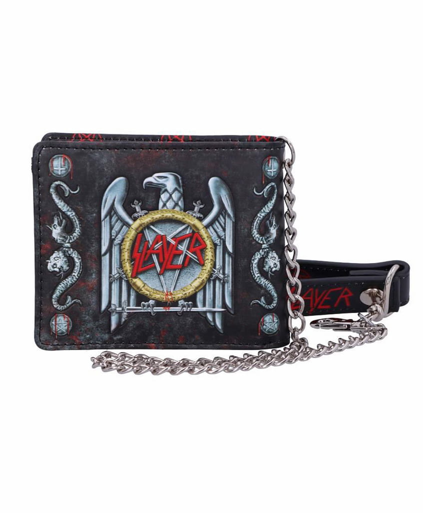 Portfel z łańcuchem SLAYER. Wykonany ze skóry ekologicznej, obszyty czarnymi nićmi. Portfel zdobiony z obydwu stron nadrukiem z tłoczeniami oraz nadrukiem metodą ALL PRINT w środku. Posiada liczne przegródki na dokumenty oraz banknoty. Dołączony metalowy łańcuch posiada karabinek oraz skórzany pasek, który można przypiąć do szlufki spodni. Portfel wykonany niezwykle starannie.