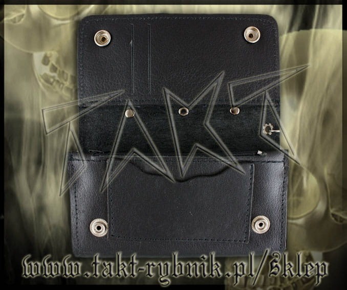 Portfel z łańcuchem EAGLE duży. Wykonany ze skóry, obszyty czarnymi nićmi. Zapinany na dwa duże, metalowe zatrzaski. W środku posiada przegródki na dokumenty, miejsce na banknoty oraz zapinaną kieszonkę na monety. Dołączony metalowy łańcuch posiada ozdobny skórzany pasek zapinany na zatrzask, który można przypiąć do szlufki spodni. Portfel wykonany niezwykle starannie.