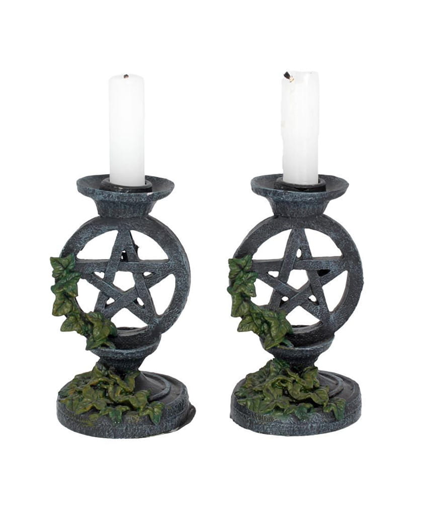 Materiał : żywica polimerowa. Niezwykle efektowny zestaw świeczników z pentagramami zarośniętymi bluszczem.