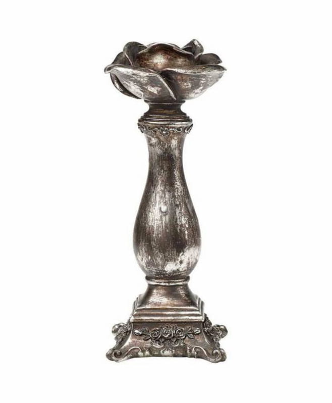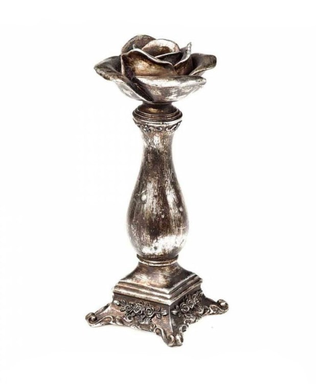 Materiał : żywica polimerowa. Niezwykle efektowny świecznik w kształcie róży w kolorze antycznego srebra.