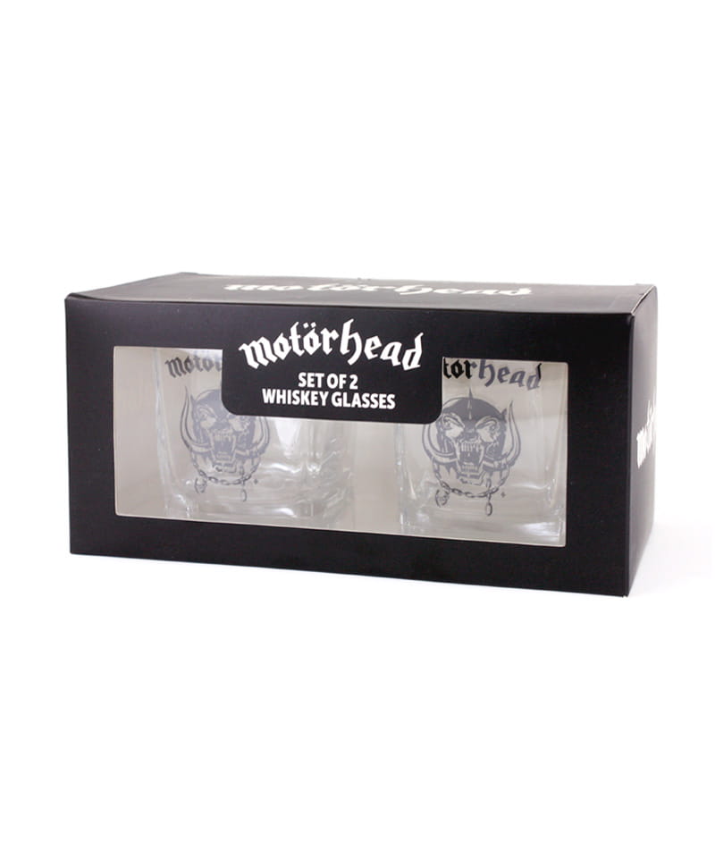 Zestaw szklanek do whisky z nadrukiem logo zespołu MOTORHEAD. Wykonane z grubego szkła. Zapakowane w ozdobny kartonik. Pojemność ok. 230 ml.