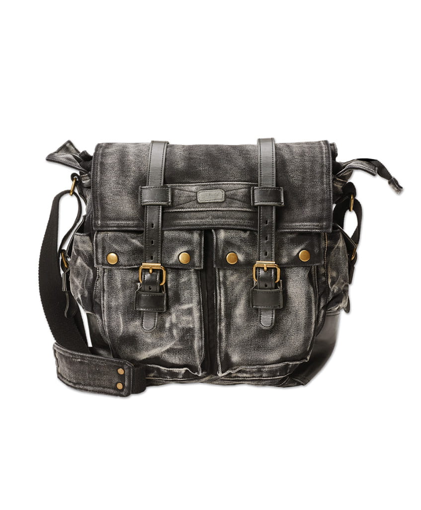 Materiał : 100% bawełna , 100% poliester pokryty poliuretanem. Kolor : sprany czarny. Metalowe elementy w kolorze starego złota. Mocna i wytrzymała torba na ramię. Posiada wiele kieszeni : dwie zapinane kieszenie z przodu torby oraz dwie znajdujące się po bokach. Główna komora zapinana na zamek. Klapa torby posiada dodatkowe zapięcie na guzik magnetyczny. Pasek o regulowanej długości.