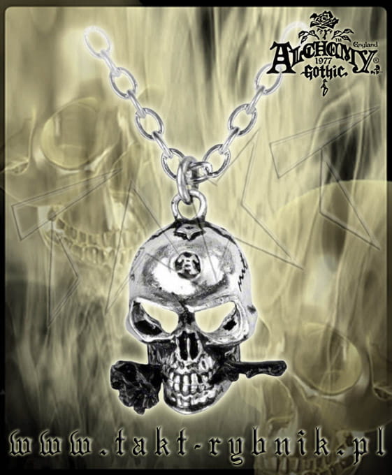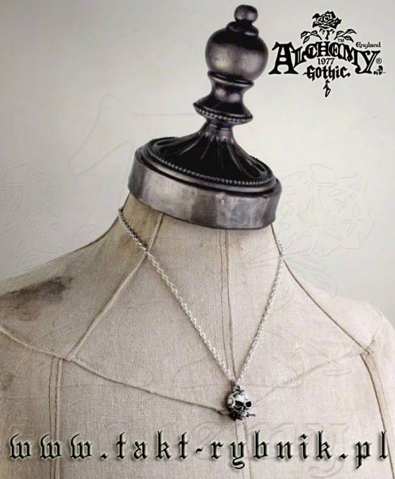 Wisiorek Alchemy THE ALCHEMIST. Metalowy odlew w kształcie czachy z czarną różą zawieszony na łańcuszku w kolorze srebrnym. Łańcuszek zapinany na karabinek.
