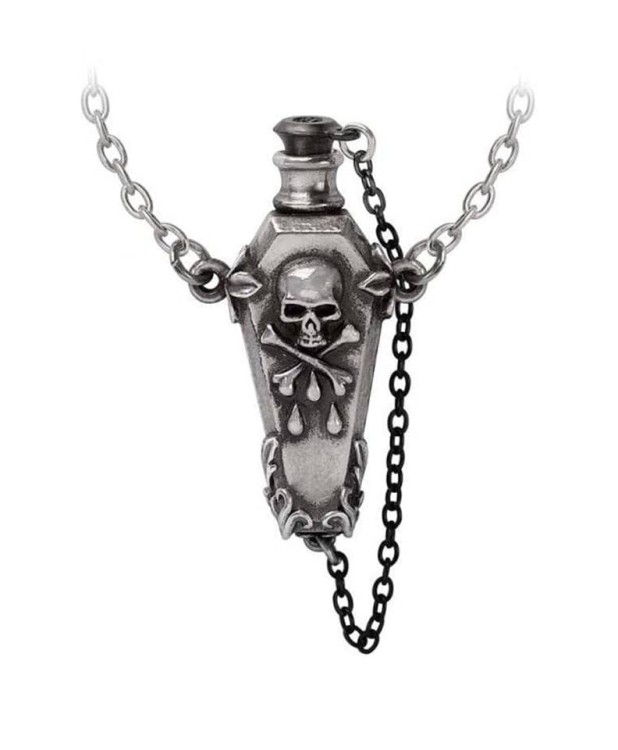 Wisiorek Alchemy THE UNDERTAKER. Zabytkowa cynowa butelka z trucizną w kształcie trumny, ozdobiona czaszką i skrzyżowanymi kośćmi. W komplecie kontrastowa czarna zdejmowana pokrywa. Całość zawieszona na łańcuszku w kolorze srebrnym zapinanym na karabinek.